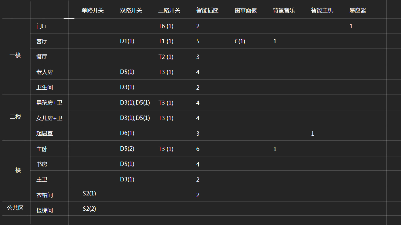 可對全屋燈光進行智能控制與管理,包括智能開關(guān)、一鍵場景、燈帶RGB調(diào)色。可對 客廳、主臥、2個小孩房的窗簾進行自動開、關(guān)、停控制。客廳、主臥、2個小孩房實現(xiàn)高品質(zhì)背景音樂享受。一樓入戶門廳、樓梯間區(qū)域智能燈光人體感應各房間配比智能插座共41個,實現(xiàn)智能控制可視音樂云門鈴,自定義門鈴音樂。悠達APP及背景音樂控制面板管理全屋悠達智能設備。