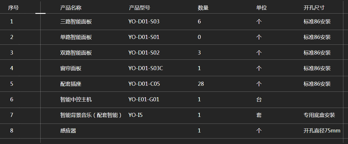 可對全屋燈光進行智能控制與管理,包括智能開關、一鍵場景、燈帶RGB調色。悠達APP及背景音樂控制面板管理全屋悠達智能設備。客廳實現高品質背景音樂享受客廳入戶 走廊智能燈光人體感應各房間配比智能插座共28個,實現智能開關。可對客廳、主臥的窗簾進行自動開、關停控制。
