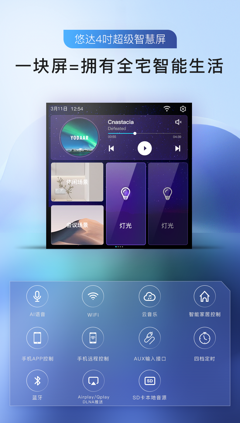 想聽歌時,它是背景音樂控制屏,云音樂、手機推送、本地音樂等海量音源任你選擇。