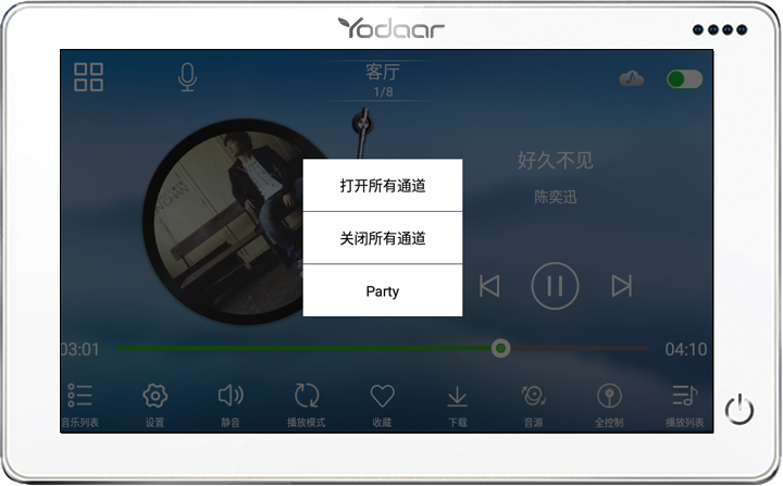 首先,最大的驚喜在于它實(shí)現(xiàn)了對(duì)所有通道的集中控制。家里裝有中央機(jī)的用戶可能會(huì)有這樣的體驗(yàn),不同房間的音樂(lè)雖然可以獨(dú)立控制,但每個(gè)房間必須單獨(dú)配置控制面板,這無(wú)疑讓安裝變得更加繁瑣,也在無(wú)形中增加了面板和布線的成本。但是現(xiàn)在,只需要一個(gè)中控屏,就可對(duì)所有房間的音源選擇、歌曲播放、音量大小、開(kāi)關(guān)機(jī)等進(jìn)行控制,并且支持一鍵Party,每個(gè)房間共享同一首音樂(lè)。