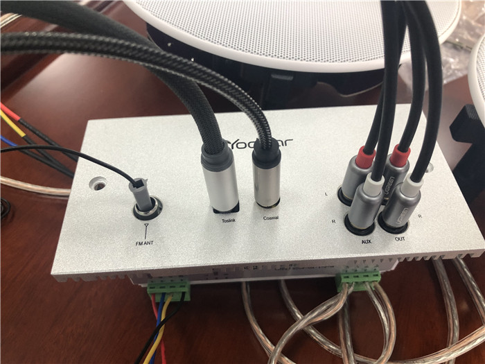 因為很多背景音樂系統不是獨立功放,所以我特意上網查了下,發現功放和控制面板分開更利于散熱,整體性能也會更加穩定。而且這些接口是悠達分體機特有的,比如FM接口插上天線后,可以聽本地的電臺,光纖/同軸解決可以接家里最新款的電視,一路AUX外接音源可以接電視或者DVD,一路音源輸出接口(OUT)可以接低音炮,功能不要太強大~