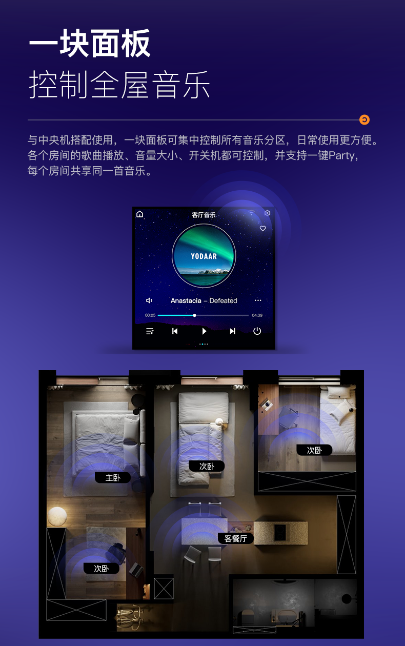 新4吋面板機身雖小,功能卻十分齊全、強大。一塊面板即可集中控制所有音樂分區,包括歌曲播放、音量大小、開關機都可控制,并支持一鍵創建/解散Party,日常聽歌更加方便。