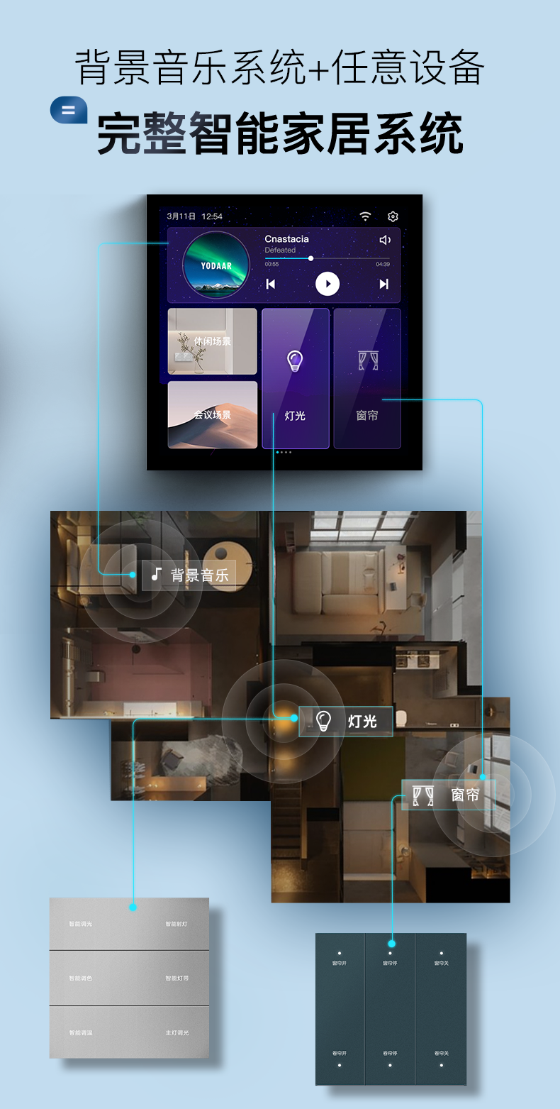 不僅如此,它還與悠達背景音樂系統深度融合,將背景音樂控制屏升級為智能中控屏后,即可輕松掌控全屋智能家居,與任意設備搭配,就是一個完整的智能家居系統,智能中控屏和智能開關面板組合,就可以實現對燈光、窗簾、背景音樂等智能設備的控制,不同智能設備如燈光、窗簾、安防等都可以根據需要靈活組建,讓你輕輕松松享受智能生活。