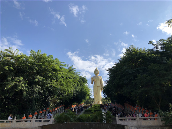版納之行的最后一站,我們來到世界南傳佛教的文化中心——勐泐大佛寺。49米高的釋迦摩尼佛像巋然聳立,俯視蕓蕓眾生,八十羅漢托缽守護兩旁,莊嚴肅穆,此番神圣之景,讓人駐足仰望,敬畏之心便油然而生。