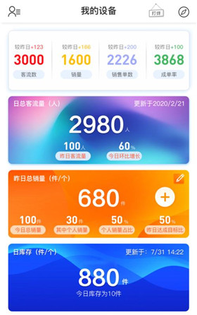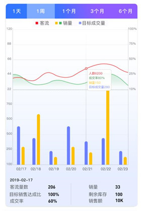 營業額是判斷經營好壞的重要標準,而只有對各項銷售數據進行深入分析,才能更好地發現問題、解決問題。針對此,悠達智慧店鋪通過可視化圖表,對門店的銷售額、目標成交量、客流轉化率等進行多維度展示,每日、每周、每月各項報表一鍵生成,以精準的數據和階段性交叉對比,幫助運營者更清晰直觀地了解門店銷售情況,并據此做出科學的銷售決策,制定合適的績效獎勵機制,激發員工銷售熱情。